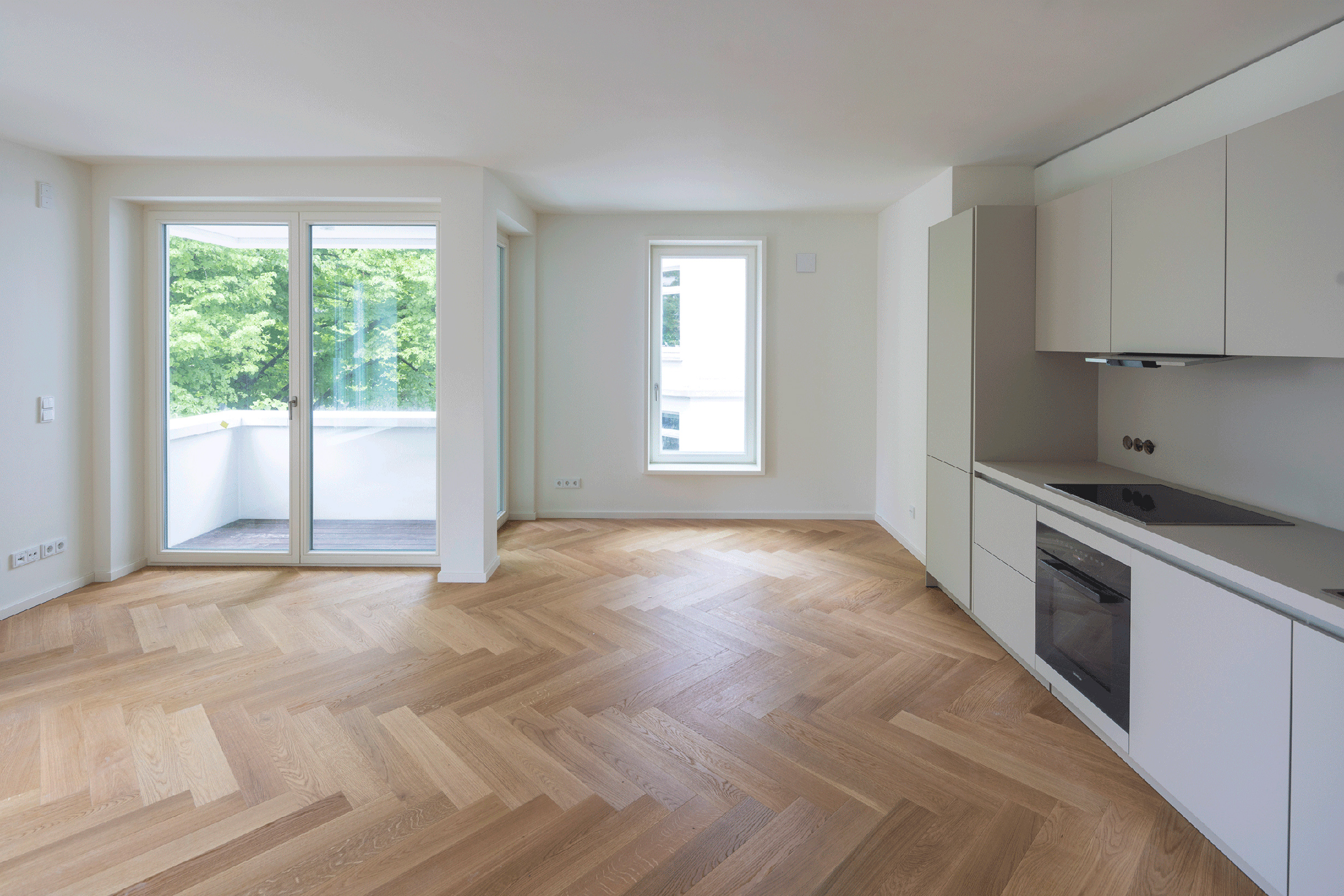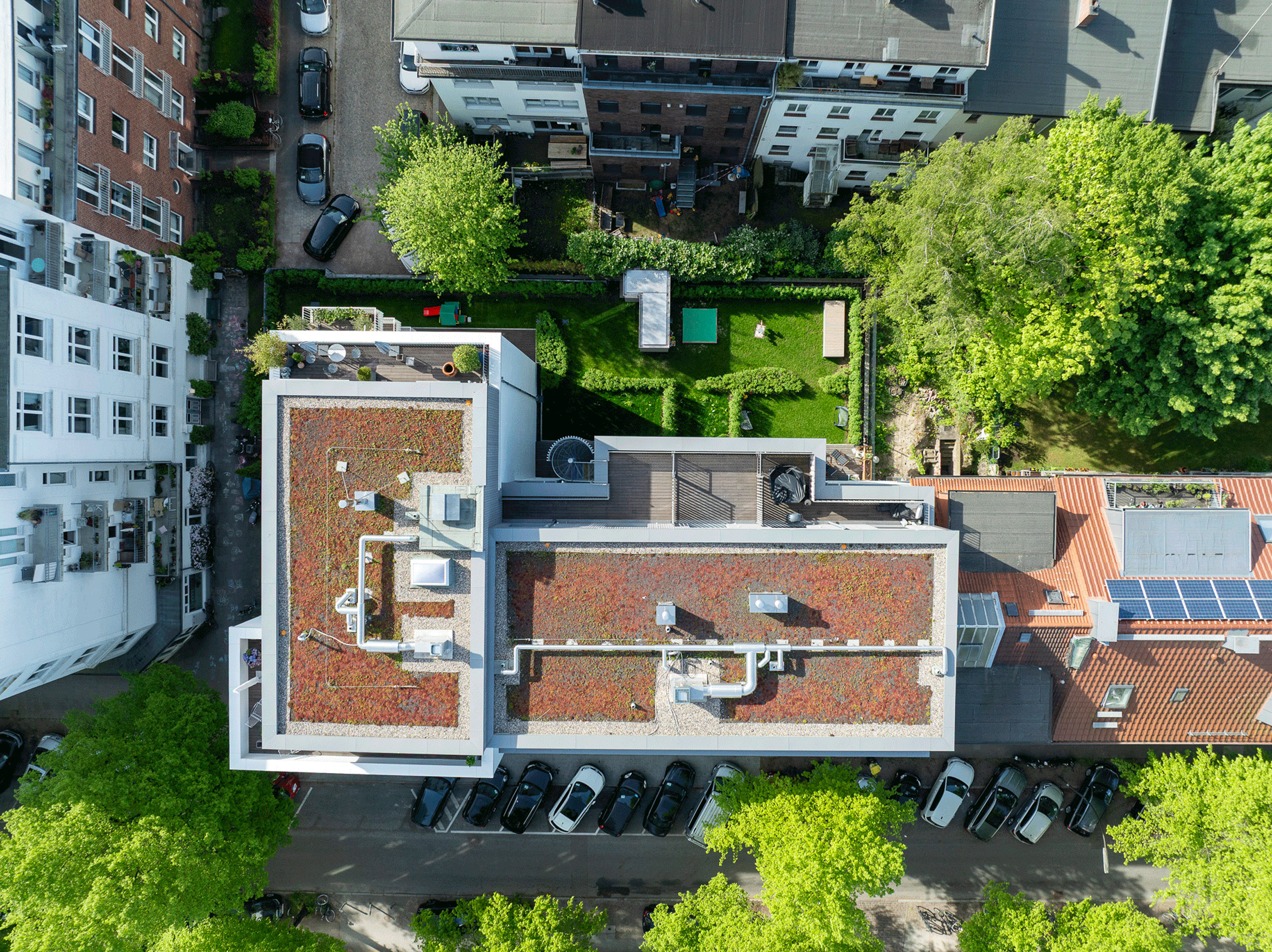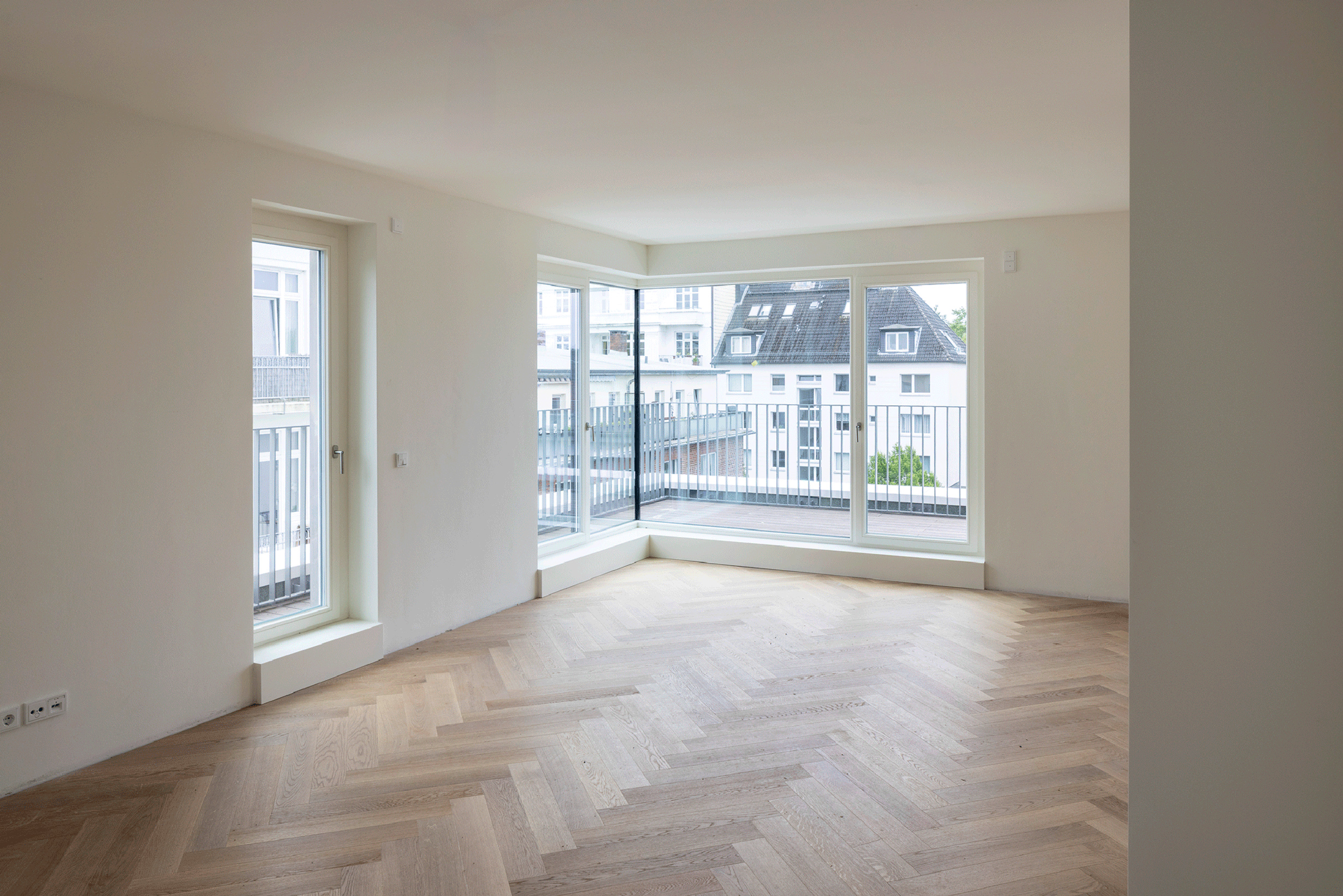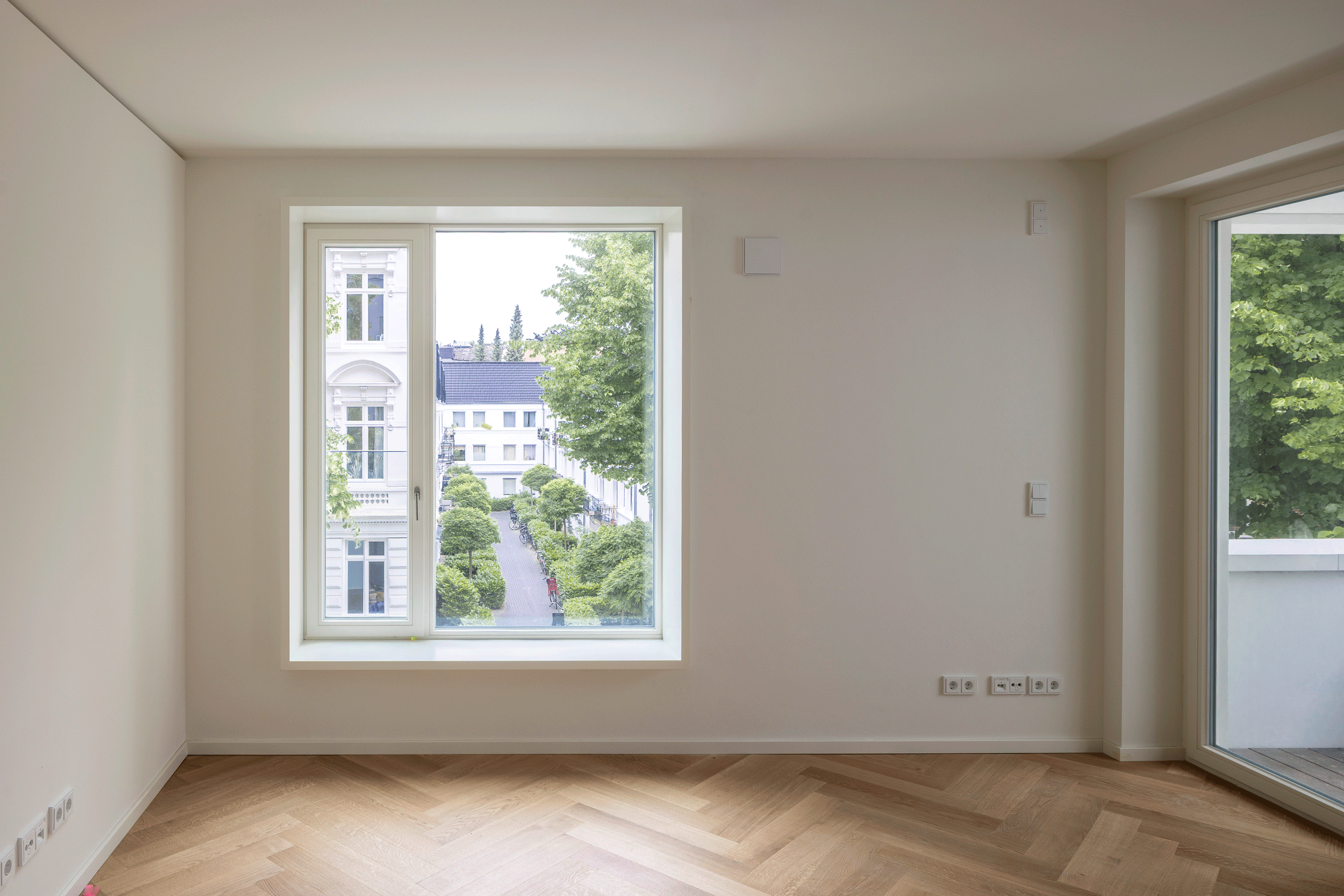 Im Gebäudeinneren ist es gelungen alle Freiräume und Besonderheiten, die die Lage des Gebäudes aufbieten konnte, zu nutzen. So ist der Blick aus großen Sitzfenstern in die Idylle eines von der Straße aus erreichbaren Innenhof. Die Loggien auf der Gebäudeecke haben einen weiten Blick entlang der Straße in westlicher Richtung und alle 3 Penthäuser genießen die wunderbare Atmosphäre über den Dächern Winterhudes.