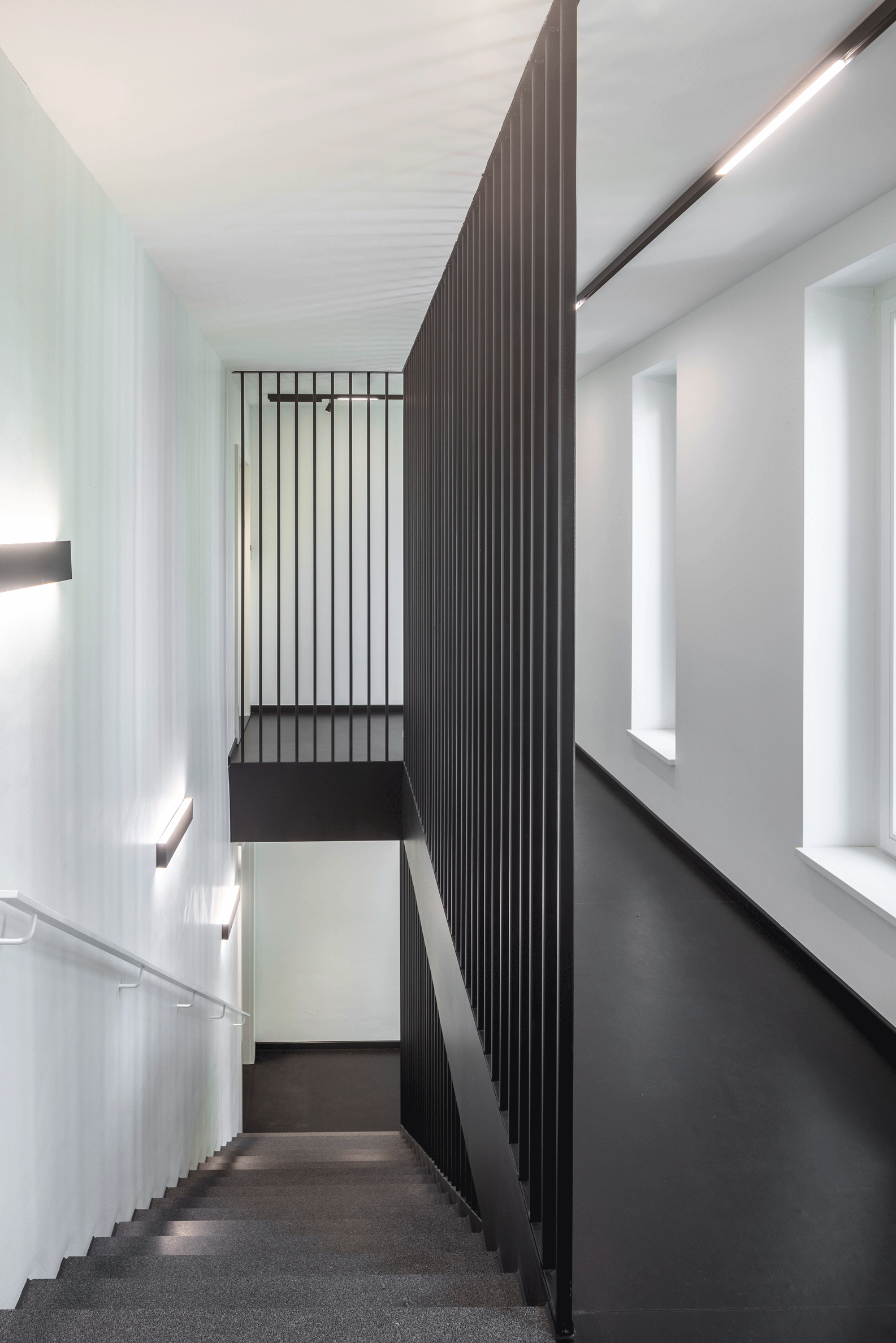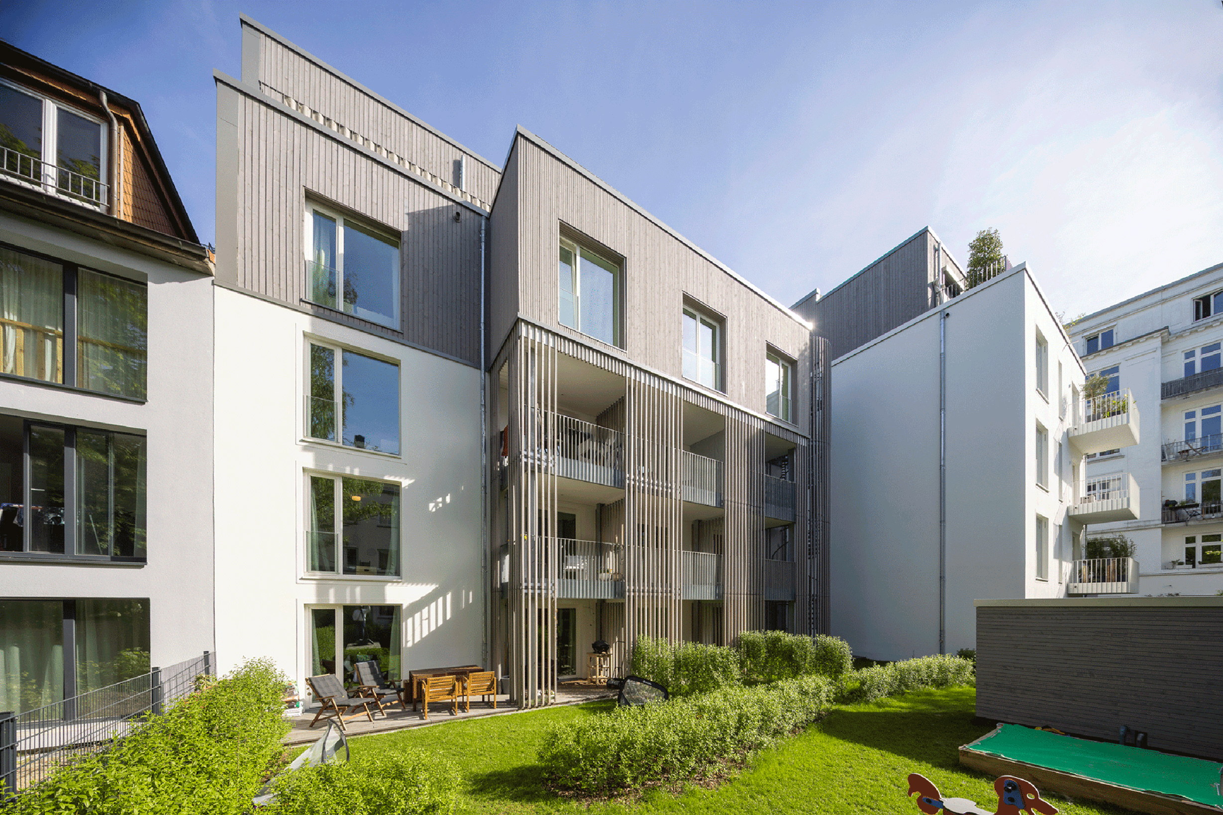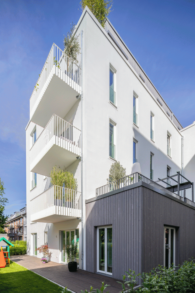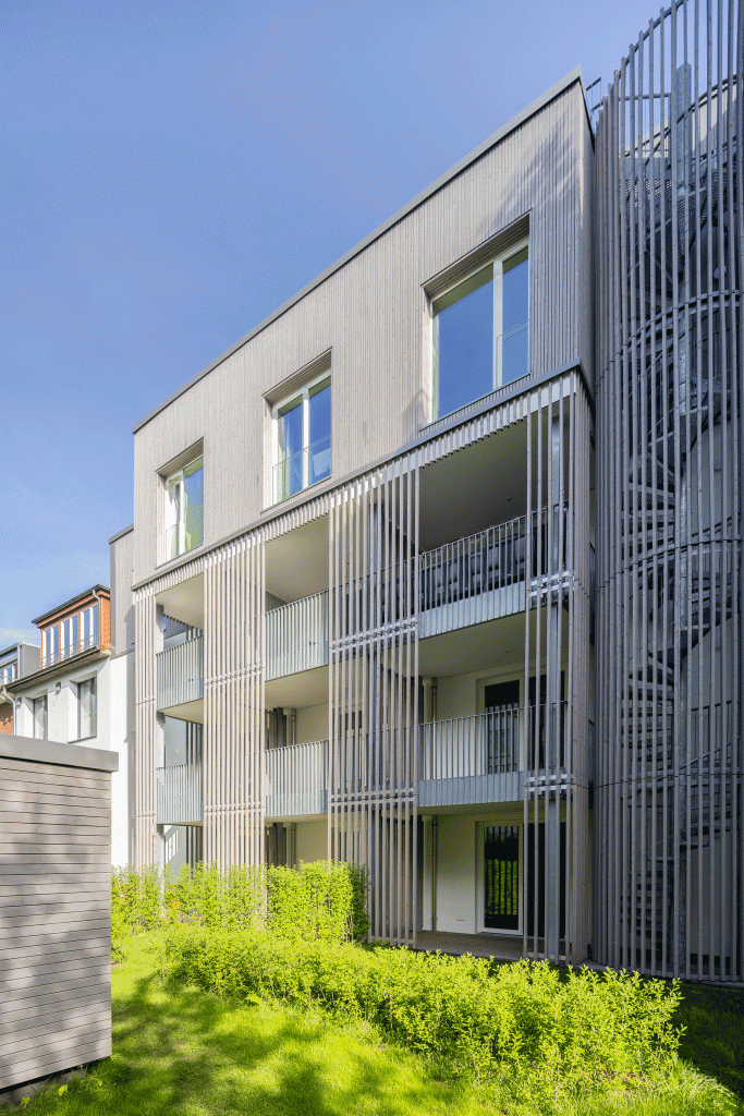 Das Bestandsgebäude wurde um zwei Etagen in Holzbauweise ergänzt: ein 3. Obergeschoss in den Baufluchten des Hauses sowie ein zurückgesetztes Staffelgeschoss. Hier entstanden drei moderne Maisonette Wohnungen mit eigenem Rettungsweg über eine außenliegende Spindeltreppe. Die Fassade erhielt eine zeitgemäße Dämmung, neue Fenster mit klarerer Gliederung sowie aufgesetzte, rahmende Faschen. Das Staffelgeschoss wurde in leichter Bauweise errichtet und mit vorgegrauter Holzverkleidung optisch zurückgenommen. Ein direkt anschließender Neubau tritt leicht aus der Flucht hervor und ist farblich auf den Bestand abgestimmt. So verbinden sich auf unbeschwerte Weise die 3 Bauteile (Bestand Aufstockung und Neubau) zu einem großen Ganzen und das nun fünfgeschossige Wohngebäude fügt sich harmonisch in das Straßenbild ein und bietet zugleich modernen Wohnkomfort. Die neue Balkonanlage auf der Südseite greift das Gestaltungsmotiv der Fassade auf: Sie wird mit Lamellen aus demselben vorgegrauten Holz verkleidet.